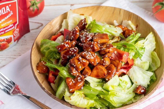 Лёгкий и быстрый тёплый салат с курицей терияки станет изюминкой вашего стола.