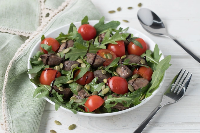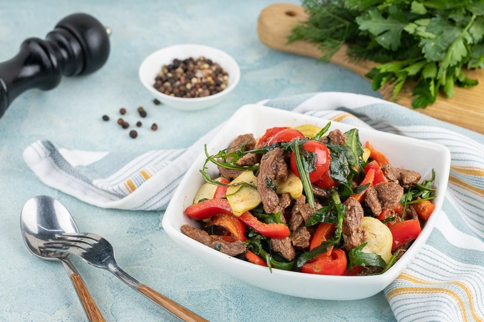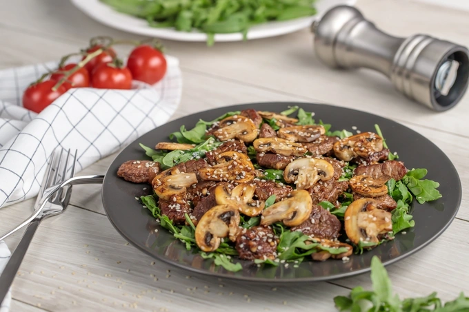 Тёплый салат с рукколой и говядиной получается сытным и вкусным. Его можно подать на обед в качестве второго блюда или на ужин как основное.