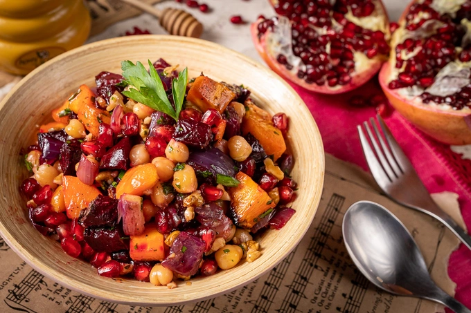 Вкусный, полезный салат из запечёнными овощами и гранатом может стать прекрасным дополнением к обеду или ужину.