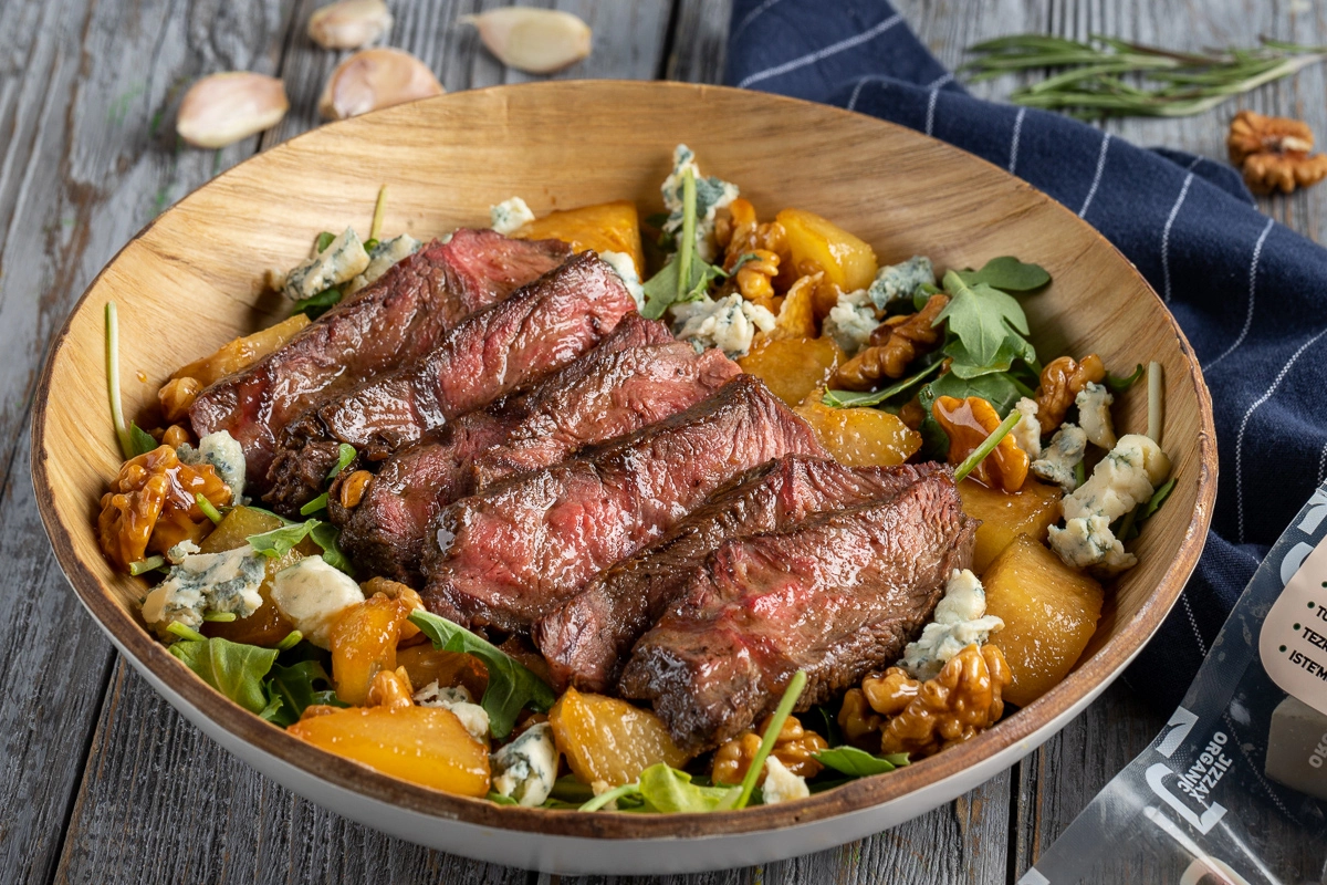 Это изысканный салат, в котором сочетаются вкус сладкой груши, хрустящей зелени, сыра и нежного жареного стейка из говядины.