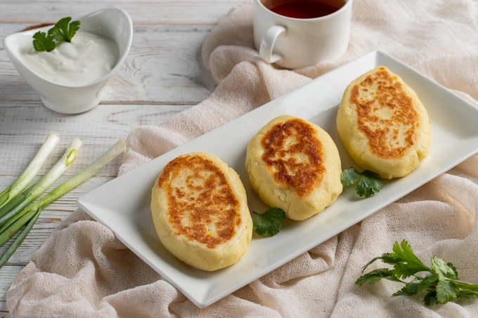 Очень вкусные и пышные лепёшки с картофелем и сыром на сковороде.