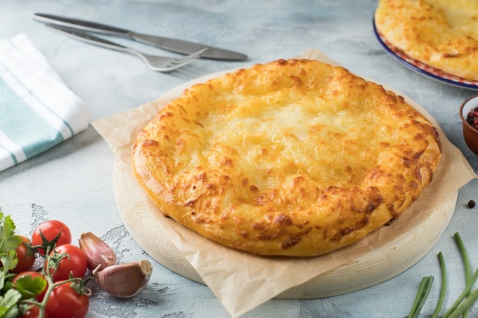 Пышное хачапури с сырной начинкой, запечённое с яйцом в центре, — простое и вкусное грузинское блюдо.