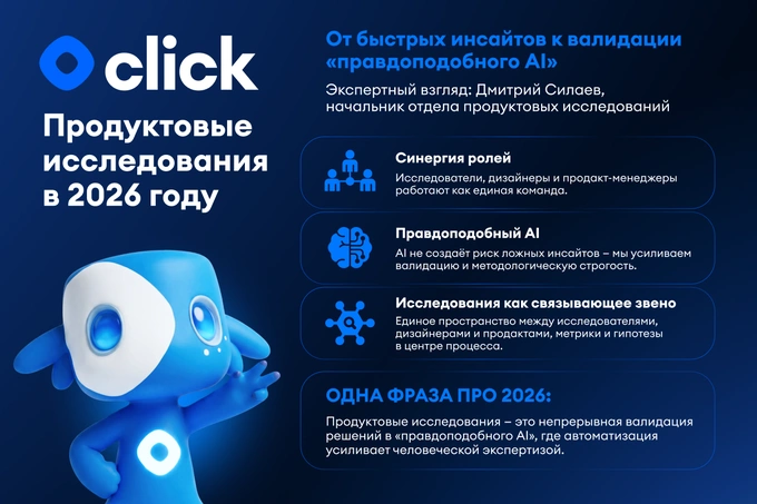 Дмитрий Силаев, начальник отдела продуктовых исследований Click, отмечает: к 2026 году продуктовые исследования окончательно закрепятся как один из ключевых инструментов принятия бизнес-решений, становясь быстрее, технологичнее и теснее интегрированными в продуктовые и бизнес-процессы — на фоне растущей роли AI.