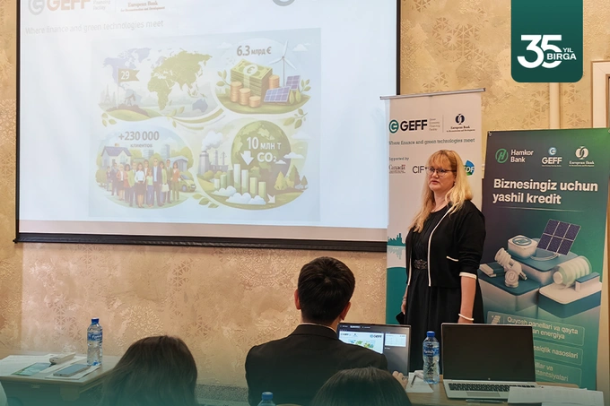 Также в рамках семинара была представлена подробная информация об условиях финансирования зелёных проектов через Hamkorbank в рамках программы GEFF, процессе получения кредита, этапах оценки и реализации проектов. Кроме того, были представлены успешные кейсы предпринимателей, внедривших энергоэффективные технологии в своём бизнесе.