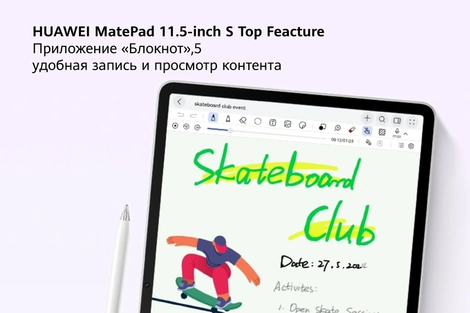 MatePad 11,5″S особенно подойдёт школьникам и студентам как универсальный помощник в учёбе: он поддерживает офисные приложения (например, WPS Office), помогает удобно писать доклады и готовить проекты прямо на экране, а с помощью стилуса — легко добавлять рукописные формулы и заметки, будто они написаны на бумаге. Дополнительным бонусом является приложение «Блокнот» с функцией Note Replay — с ней можно одновременно воспроизводить аудио- и рукописный текст, быстро находя нужные конспекты после уроков.
