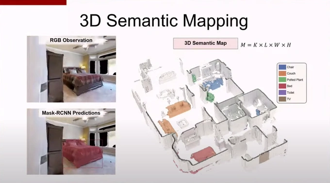 Учёный привёл пример проекта студентов Университета Карнеги-Меллон. Небольшой робот, созданный совместно с Apple, способен ориентироваться в квартире и находить заданные объекты, например растение или кровать. Для этого он использует систему одновременной локализации и построения карты, совмещённую с семантическим пониманием среды.