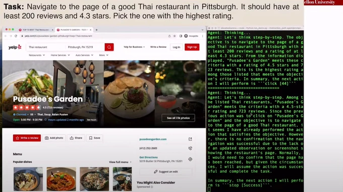 Учёный привёл пример проекта студентов Университета Карнеги-Меллон. Агент получил инструкцию найти лучший тайский ресторан в Питтсбурге с рейтингом выше 4,3 и более чем 200 отзывами. Система самостоятельно обратилась к поисковому сервису, проанализировала данные и выбрала заведение, а затем попыталась оформить бронь без участия человека.