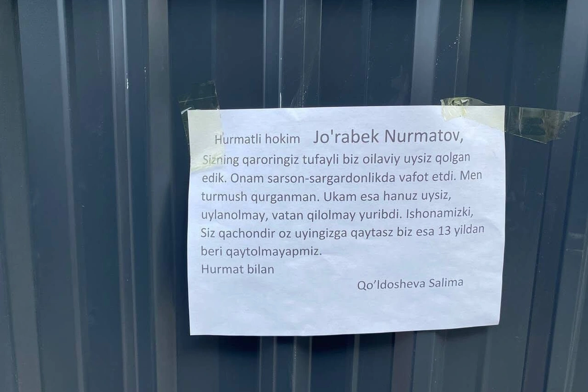 «Уважаемый хоким Журабек Нурматов, из-за вашего решения мы с семьёй остались без жилья. Моя мать умерла в скитаниях. Я замужем, а мой брат до сих пор бездомный, не может жениться и обрести свой угол. Мы верим, что вы когда-нибудь вернётесь домой, а мы уже 13 лет не можем вернуться в наш. С уважением, Кулдашева Салима», — написано в письме.