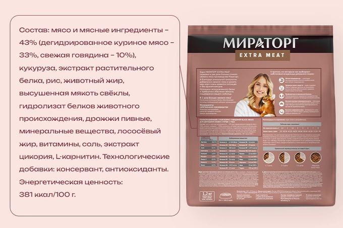 А теперь можно разобрать, как правильный подход к рецептуре реализован на примере бренда «Мираторг». В рационах этой марки строго соблюдён главный принцип здорового питания питомцев. У кормов «Мираторг» мясо №1 в составе. Это означает, что именно качественный животный белок выступает надёжным фундаментом корма. Главная особенность производства заключается в технологии добавления свежего мяса напрямую в состав на этапе замешивания. Такой подход даёт возможность сохранить максимум полезных свойств и делает корм привлекательным для животного за счёт естественного вкуса, полностью исключая необходимость использовать искусственные добавки.