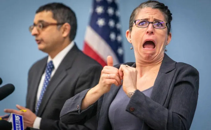 Сертифицированный глухой переводчик Реган Тибодо переводит на пресс-брифинге Центра по контролю заболеваний в США во время пандемии COVID-19. Фото: Abigail Curtis, Bangor Daily News, primetimer.com.