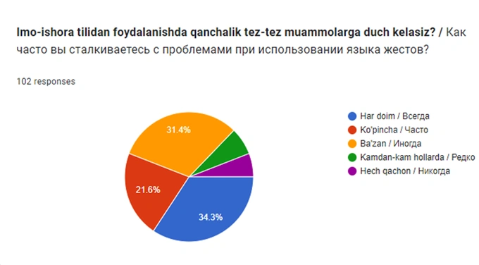 Результаты опроса, проведённого движением «Юксалиш» в прошлом году среди 102 лиц с инвалидностью по слуху, показали, что более половины (56%) респондентов «всегда» или «часто» сталкиваются с трудностями при использовании жестового языка. В общей сложности для почти 90% опрошенных это является периодической или постоянной проблемой, и лишь 6% никогда не испытывают подобных сложностей.