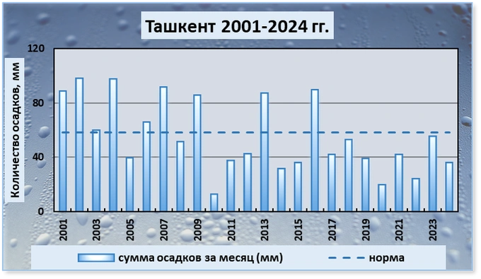 Последние восемь лет декабри в Узбекистане были сухими, то есть осадков выпадало меньше нормы, отмечается в обзоре.