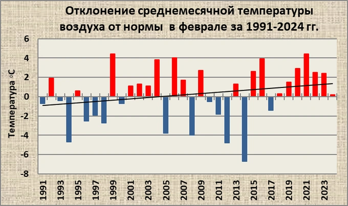 В этом веке самыми тёплыми в целом были феврали 2004, 2016 и 2021 годов, когда средняя месячная температура превышала климатическую норму на 3−6 градусов. В эти годы в самые тёплые периоды температура воздуха повышалась до +22…+27 градусов, по югу — до +28…+30, что больше характерно для середины весны.