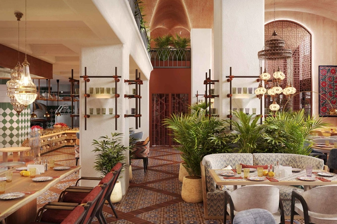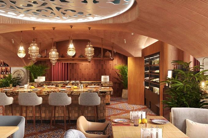С первых шагов гость словно оказывается в атмосфере Востока: на первом этаже — открытая кухня с мангалом и дровяными печами. Интерьер, созданный командой Krivtsova & Redina, напоминает восточный дворец со сводчатыми потолками и мягкими текстурами, создавая ощущение роскоши и уюта.