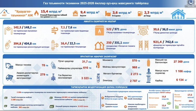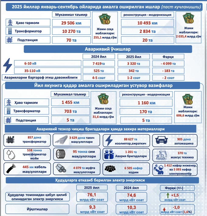 Он сообщил, что с начала года обновлены 7455 км линий электропередачи и 1748 трансформаторных пунктов. Это улучшило электроснабжение более 800 тысяч домохозяйств в 954 махаллях.
