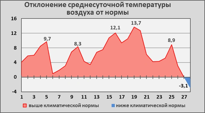 Температурный режим февраля был нехарактерным для последнего месяца зимы. Практически весь месяц наблюдалась очень тёплая погода. Даже в короткие периоды относительного похолодания среднесуточная температура воздуха в основном оставалась выше нормы и лишь в последний день февраля опустилась на 2−3 градуса ниже нормы.Реклама на Gazeta