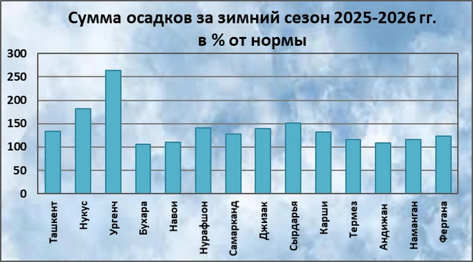 Сумма осадков за зимний сезон превысила среднемноголетние значения и составила 110−150% от нормы, в северо-западном регионе, где нормы осадков невелики — 170−260% от нормы. Особенно это заметно в сравнении с предыдущим зимним сезоном, когда сумма осадков составила 40−70%, по областям Ферганской долины менее 40% от нормы.