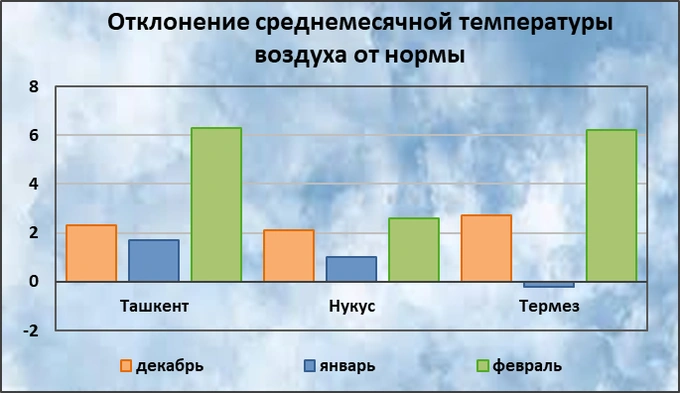 Прошедшая зима в Узбекистане была тёплой. Средняя температура зимнего сезона оказалась на 3−4 градуса, по северо-западным районам на 1−2 градуса выше климатической нормы.