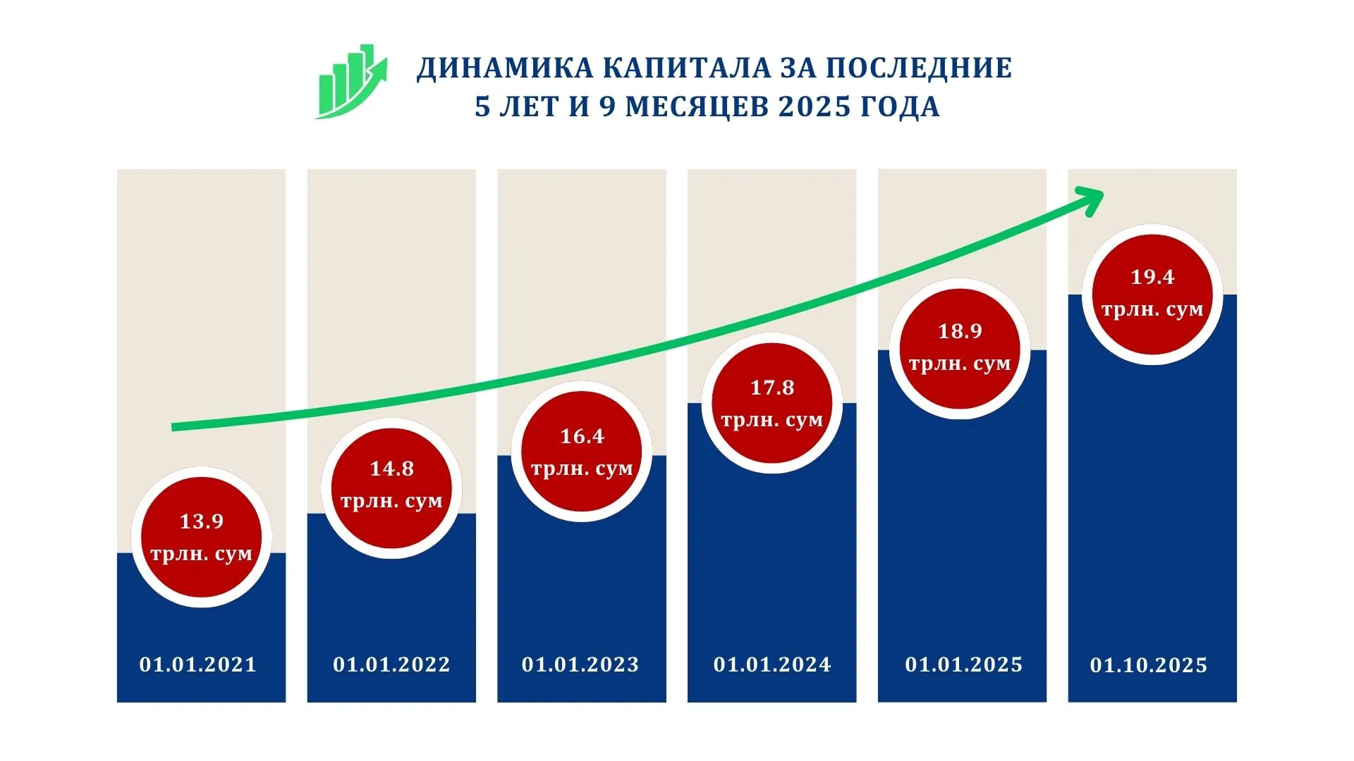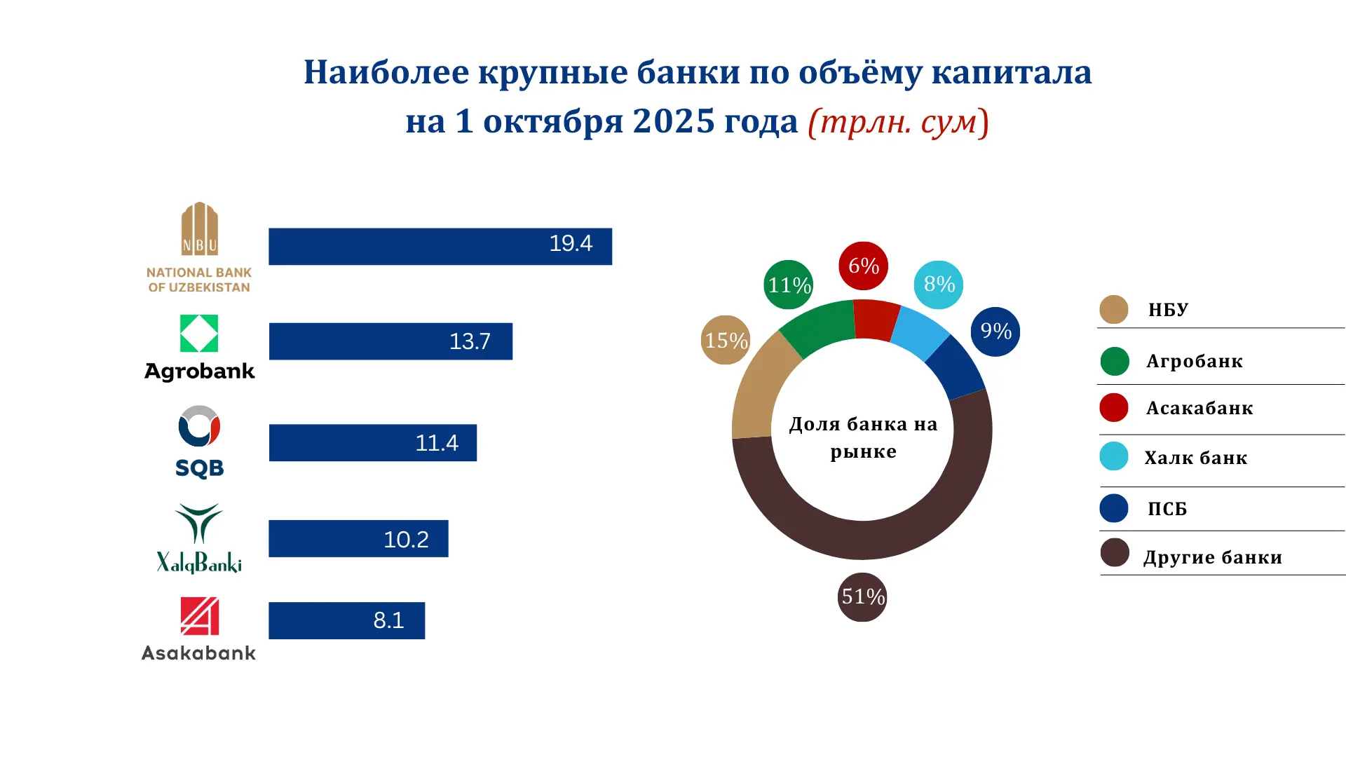 По состоянию на 1 октября 2025 года совокупный капитал банковской системы достиг 130,4 трлн сумов, увеличившись на 13,6% за девять месяцев 2025 года. Среди крупнейших банков по объёму капитала НБУ занимает высокие позиции: его капитал составляет 19,4 трлн сумов, что соответствует рыночной доле 15%. Далее следуют «Агробанк» (13,7 трлн сумов, 11%), SQB (11,4 трлн сумов, 9%), «Халк банк» (10,2 трлн сумов, 8%) и «Асакабанк» (8,1 трлн сумов, 6%).