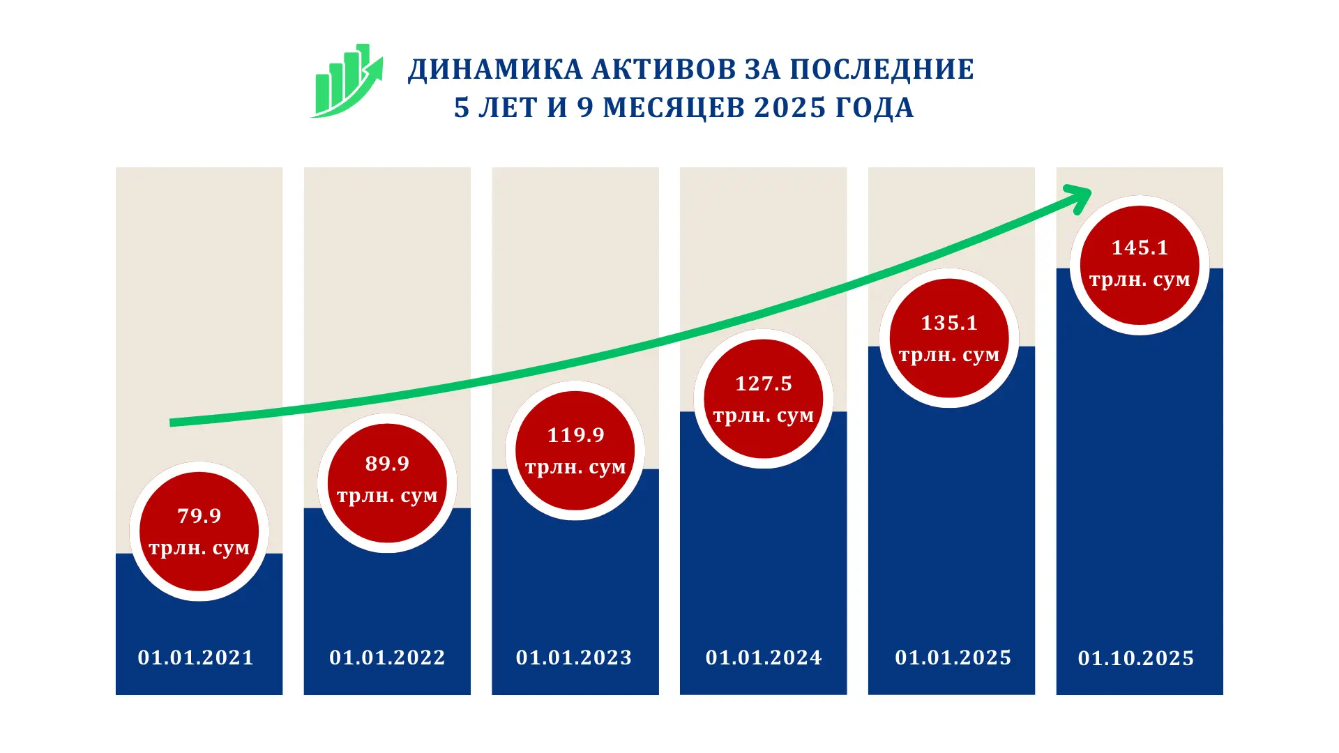 Банковский сектор Узбекистана демонстрирует уверенный рост активов: к 1 октября 2025 года их совокупный объём достиг 866,8 трлн сумов, увеличившись на 12,7%. На этом фоне активы НБУ составили 145,1 трлн сумов, что обеспечивает банку одно из ведущих мест в национальном рейтинге по масштабу баланса и долю 16,7% в активах всей банковской системы.