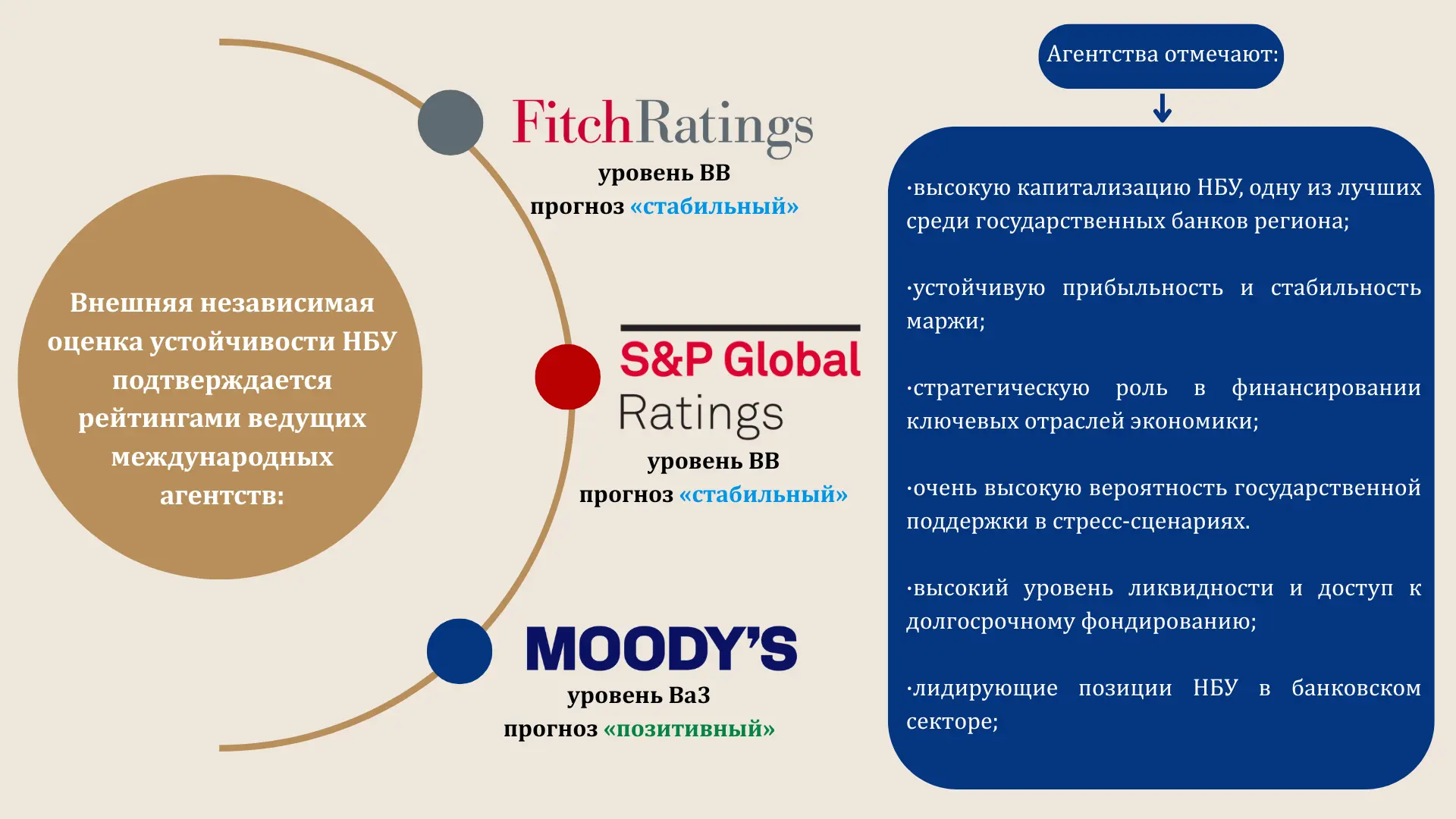 Данное решение отражает совокупный эффект масштабов операций, устойчивой капитализации, сбалансированного профиля рисков и последовательной трансформации бизнес-модели банка, его системную значимость для экономики страны, а также высокую степень доверия к финансовому профилю и институциональной роли НБУ со стороны независимых международных аналитиков.