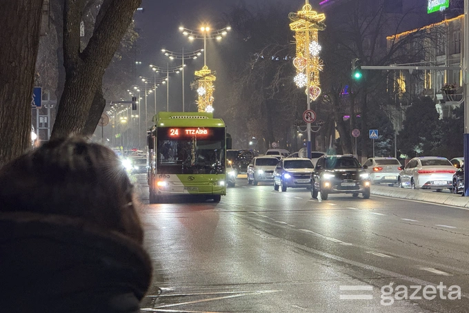 Одним из самых заметных стал сочленённый автобус («гармошка») №24, курсирующий по маршруту Махалля «Янгихаёт» — Юнусабад, 6-й квартал. Окна транспорта снаружи расписали новогодними мотивами: снежинками, ёлочками, весёлыми снеговиками. На левом борту автобуса как напоминание о приближающемся празднике красуется надпись «2026».