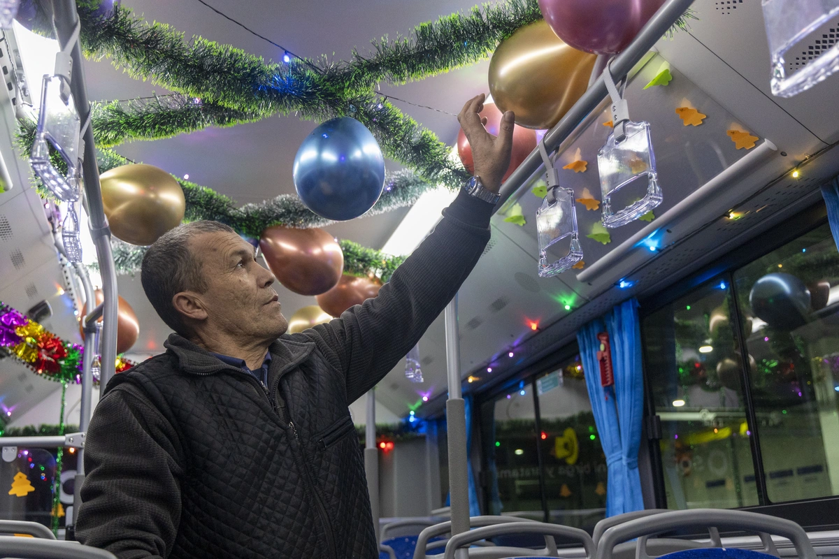 Для гостей и жителей Ташкента украшенные к Новому году столичные автобусы стали неотъемлемым атрибутом праздника. Водители самостоятельно украшают свой транспорт гирляндами, фонариками и ёлочными игрушками, расписывают окна и двери. «Газета» поговорила с водителями об этой традиции.
