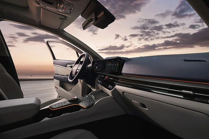Салон нового Kia Sportage выполнен в современном стиле с чётко выраженным горизонтальным зонированием. Передняя панель ориентирована на водителя, а панорамный изогнутый экран объединяет 12,3-дюймовую цифровую приборную панель и 12,3-дюймовый дисплей мультимедийной системы, создавая эффект полного визуального погружения. В базовой версии используется приборная панель Supervision с цветным экраном 4,2 дюйма.