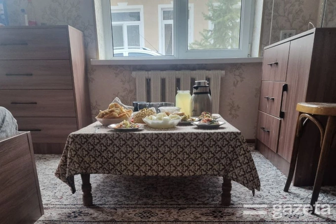 Стол, накрытый к ифтару, в спальне сестры Нозимы Махмудовой. Только в этой комнате работает кондиционер.