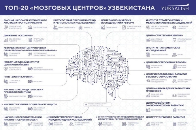 По имеющимся оценкам, сегодня в Узбекистане насчитывается около 20 негосударственных аналитических центров. Согласно анализу движения «Юксалиш», в текущем году в ТОП-20 «мозговых учреждений» страны вошли около 10 негосударственных центров.