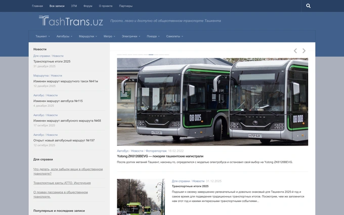 Помимо метро, на сайте Tashtrans.uz собрана информация обо всех других видах транспорта столичного региона — автобусы, маршрутки, поезда (отдельно — электрички) и самолёты. Здесь можно узнавать об изменении маршрутов, тарифов, обновлении расписаний, есть обширная база собственных фотографий, справочник и форум. Вся информация регулярно и оперативно обновляется, зачастую раньше, чем об этом сообщат официально.