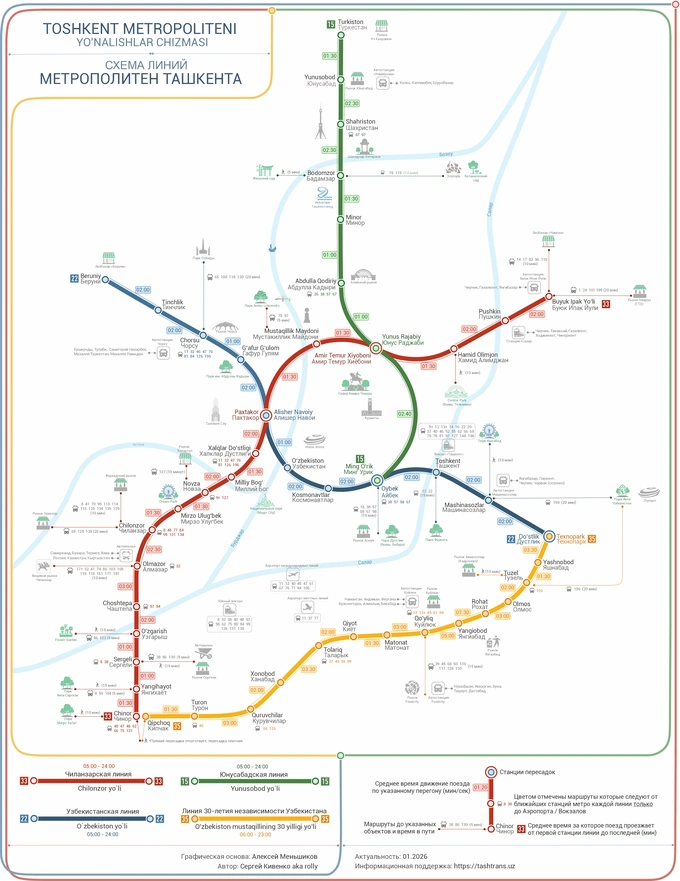 То, что карта воспринимается как официальная, — совсем не удивительно. Она отличается качеством исполнения, продуманностью, удобством и детализацией. Более того, эта карта знакома многим пассажирам метро — её предыдущую версию можно встретить на станциях Кольцевой надземной линии. Схемы Сергея Кивенко с его разрешения также использовала компания «Узбекистон темир йуллари» — речь о схемах движения пригородных электричек — в вагонах этих самых поездов. «Мне просто нравится этим заниматься», — говорит владелец сайта. В беседе с «Газетой» он рассказал о проекте и его целях.