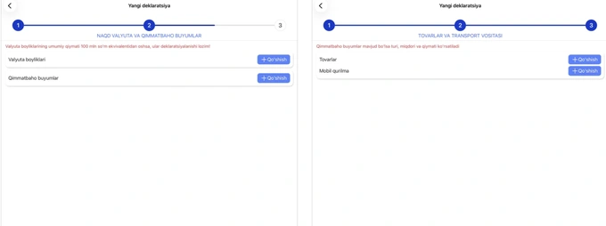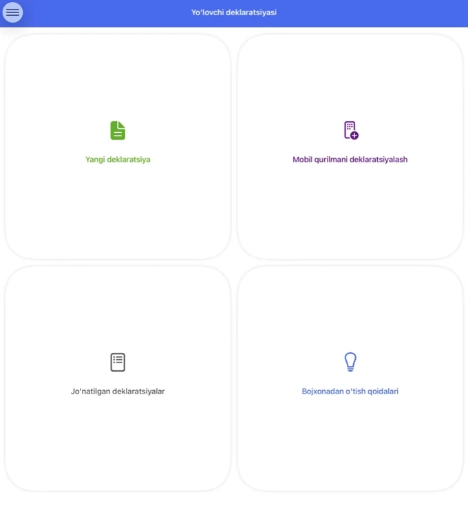 Мобильное приложение Yoʻlovchi-deklaratsiyasi («Пассажирская декларация») доступно для устройств на операционных системах Android и iOS.
