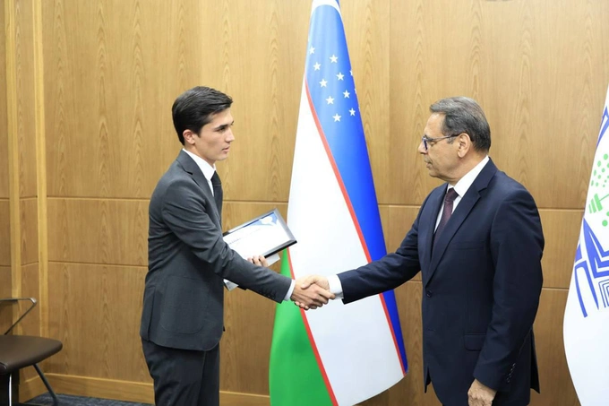 Министр высшего образования Конгратбай Шарипов и Мухриддин. Фото: Министерство высшего образования.