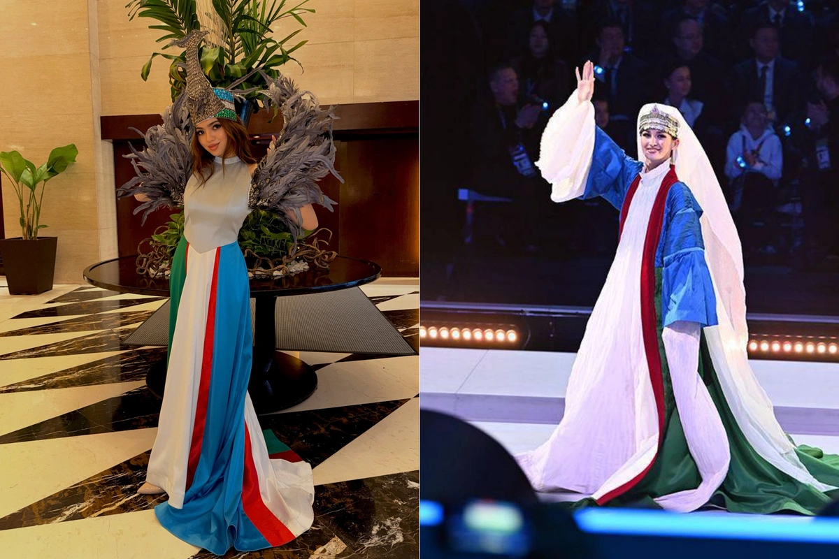 «Наряды из традиционных узбекских тканей адрас и атлас очень известны, их можно часто увидеть на разных фестивалях и конкурсах. Участвуя в международных конкурсах красоты, я видела, как участницы из Америки, России, Турции и других стран выступают в платьях в цветах или с элементами государственных символов своих стран. Я тоже хотела выйти на сцену в таком платье. Поэтому я решила участвовать в конкурсе в платье не из адраса, а из ткани цветов флага», — сказала модель.