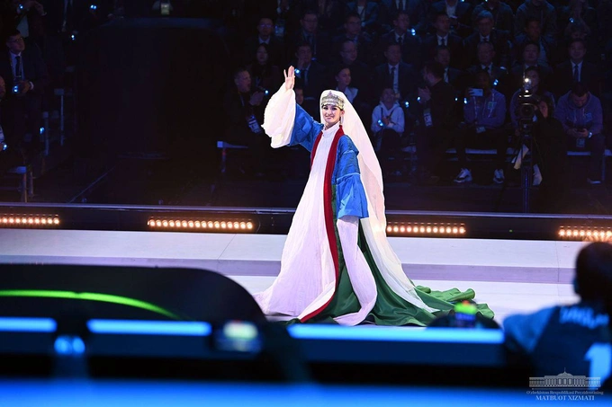 Шахризода Мадаминова рассказала, что выбор платья в цветах флага Узбекистана (белый, голубой, зелёный, красный) был обусловлен её желанием сделать страну ещё более узнаваемой.