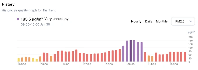 Утром в пятницу, 30 января, Ташкент вновь оказался в лидерах международного антирейтинга качества воздуха сайта IQAir. В воздухе отчётливо ощущался запах гари.