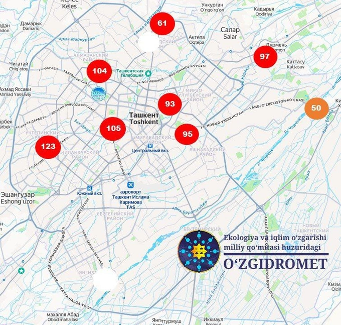По данным Узгидромета, средний суточный показатель PM2,5 в Ташкенте на 18:00 30 января составил 91 микрограмм на кубометр воздуха, что на 50% превышает норму, допустимую национальным стандартом (60 мкг/м3).