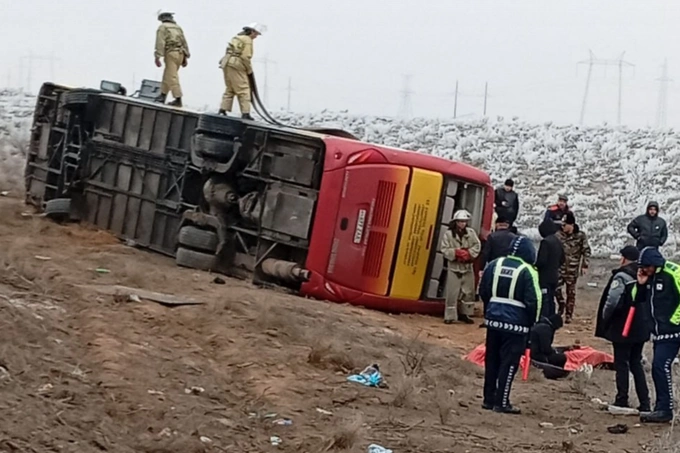Автобус с 47 пассажирами съехал с дороги и опрокинулся утром 5 января в Тамдынском районе на автодороге А-379 Навои-Учкудук.
