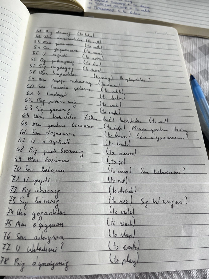Самым трудным для меня оказалось пополнение словарного запаса и закрепление грамматики. В узбекском много слов, похожих по звучанию — например, «qovun» и «qonun», «qiziq» и «qizil», «bosh» и «bo‘sh» — из-за этого их сложно запомнить. Грамматика тоже непростая: в японском нет суффиксов, которые изменяют существительные и глаголы, поэтому привыкнуть к этой системе бывает трудно. Даже если теоретически знаешь правила, применять их в разговоре сложно. К тому же без живого общения новые слова усваиваются труднее.