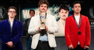 Фабиано Каруана, Магнус Карлсен и Нодирбек Абдусатторов. Фото: Lennart Ootes / Freestyle Chess Гроссмейстер Узбекистана Нодирбек ...