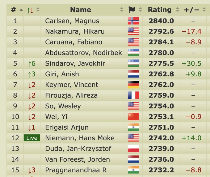 Рейтинг шахматистов — это показатель их силы, рассчитываемый по системе Эло, используемой FIDE: за победы над более сильными соперниками даётся больше очков, за поражения от слабых — больше снимается. За этот турнир Синдаров прибавил 30,5 пункта в онлайн-рейтинге, достигнув отметки 2775,5 и статуса пятого шахматиста в мировом рейтинге.Реклама на Gazeta