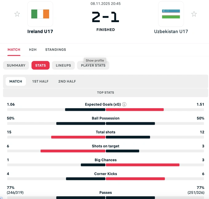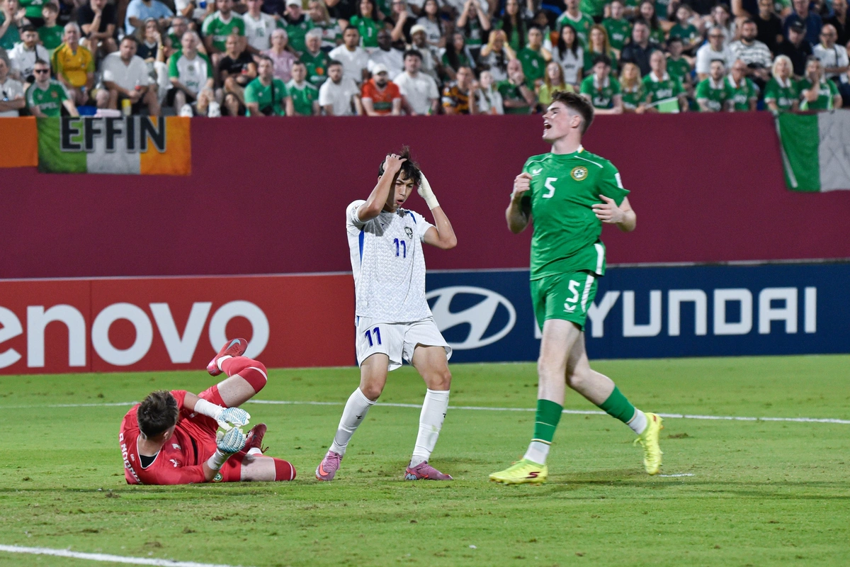 На 20-й минуте узбекистанцы открыли счёт. Абубакир Шукуруллаев оказался первым на добивании после того, как вратарь Ирландии отразил первый удар с правого фланга.