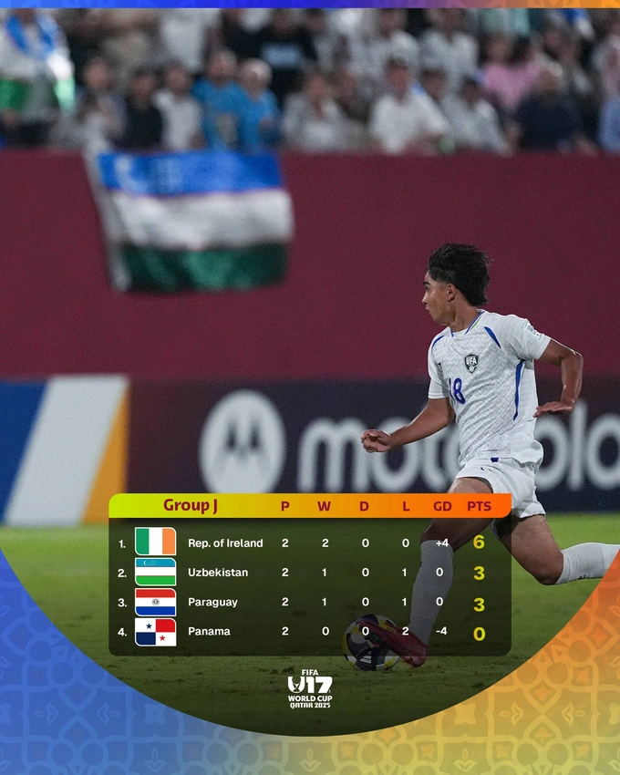 Узбекистан после второго тура в группе J занимает второе место с 3 баллами. Лидером остаётся Ирландия (6). Третье место — у Парагвая, который победил Панаму (2:1). 11 ноября в 18:30 юношескую команду ожидает встреча с Панамой.
