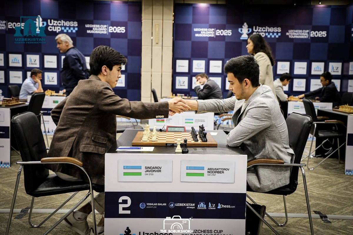 Жавохир Синдаров и Нодирбек Абдусатторов на турнире UzChess Cup в Ташкенте, 20 июня 2025 года.