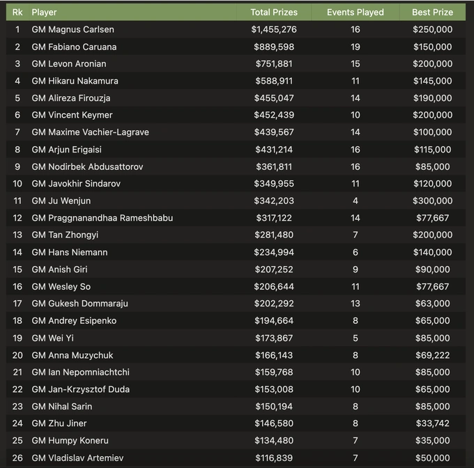 Всего по итогам 2025 года 26 шахматистов преодолели отметку в 100 тысяч долларов призовых, что стало рекордом за последние годы. Рост призовых эксперты связывают с возвращением крупных турниров с большим числом участников, проведением Кубка мира ФИДЕ, а также включением шахмат в программу Esports World Cup.