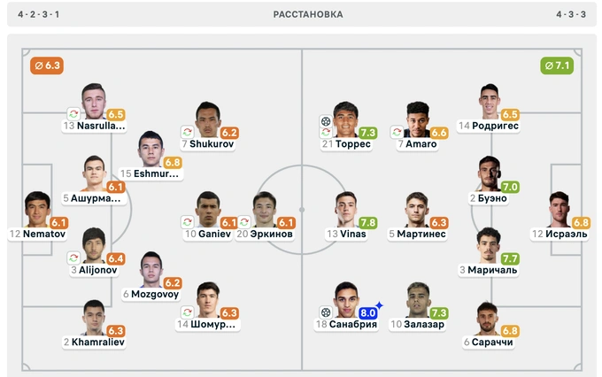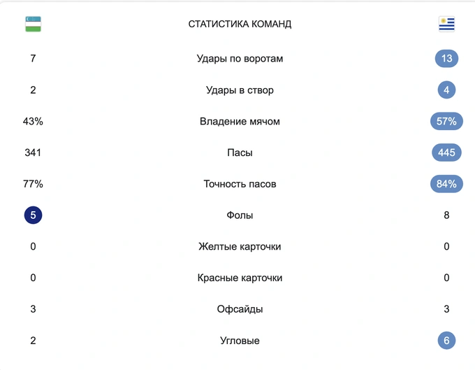 В рейтинге ФИФА Узбекистан занимает 54-е место, Уругвай — 15-е.