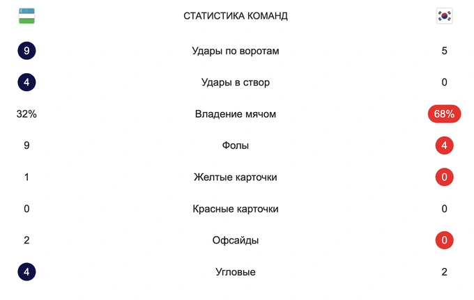 Несмотря на преимущество соперника во владении мячом (68% у сборной Кореи против 32% у Узбекистана), узбекистанцы действовали более эффективно. Узбекистан нанёс 9 ударов по воротам, из них 4 — в створ, тогда как корейская сборная ограничилась 5 ударами и не нанесла ни одного удара в створ ворот. По угловым ударам также преимущество было у сборной Узбекистана — 4:2.