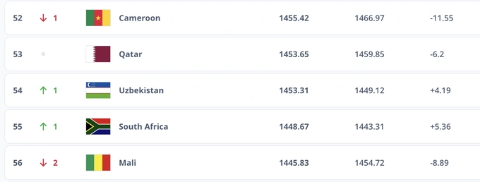 Сборная Узбекистана по футболу в сентябрьском рейтинге Международной федерации футбола (ФИФА) поднялась на одну позицию и заняла 54-е место. Сейчас у национальной команды 1453,31 балла (+4,19).