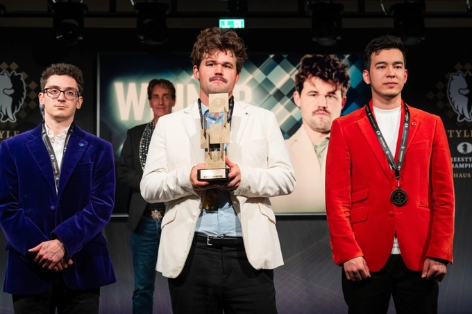 Фабиано Каруана, Магнус Карлсен и Нодирбек Абдусатторов.